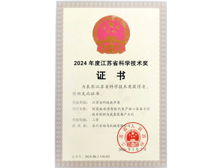 近日,苏州苏福马机械有限公司“刨花板连续智能化生产核心装备关键技术创新与成套装备产业化”项目,荣获江苏省科学技术奖科技进步二等奖。该奖项表彰本省科技领域突出贡献单位与个人,激励科技创新,推动成果转化,