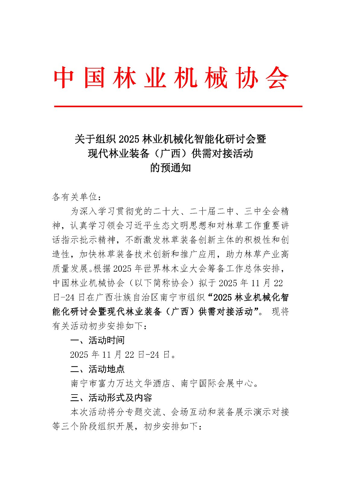 关于组织2025林业机械化智能化研讨会暨现代林业装备(广西)供需对接活动的预通知