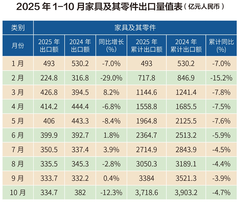 前10月家具及其零件出口额3718.6亿元,同比下降4.7%